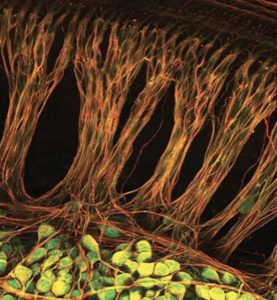 شکل بالا نشان دهنده نورون های واقع در گره های مارپیچی، در قسمت حلزونی گوش میباشد. این نورونها از نوع دوقطبی میباشند و اولین نورونهایی در سیستم شنوایی هستند که فعال می شوند. عملکرد این سلولها در اختلال وزوز گوش، معیوب است. اگر موهای روی سطح این نورونهای عصبی آسیب ببینند، در هر جهت حرکت میکنند. بنابراین سلولهای شنوایی سیگنال های غیرطبیعی را به مغز ارسال میکنند که موجب میشود مغز یک صدای غیر طبیعی مانند وزوز گوش ایجاد کند.